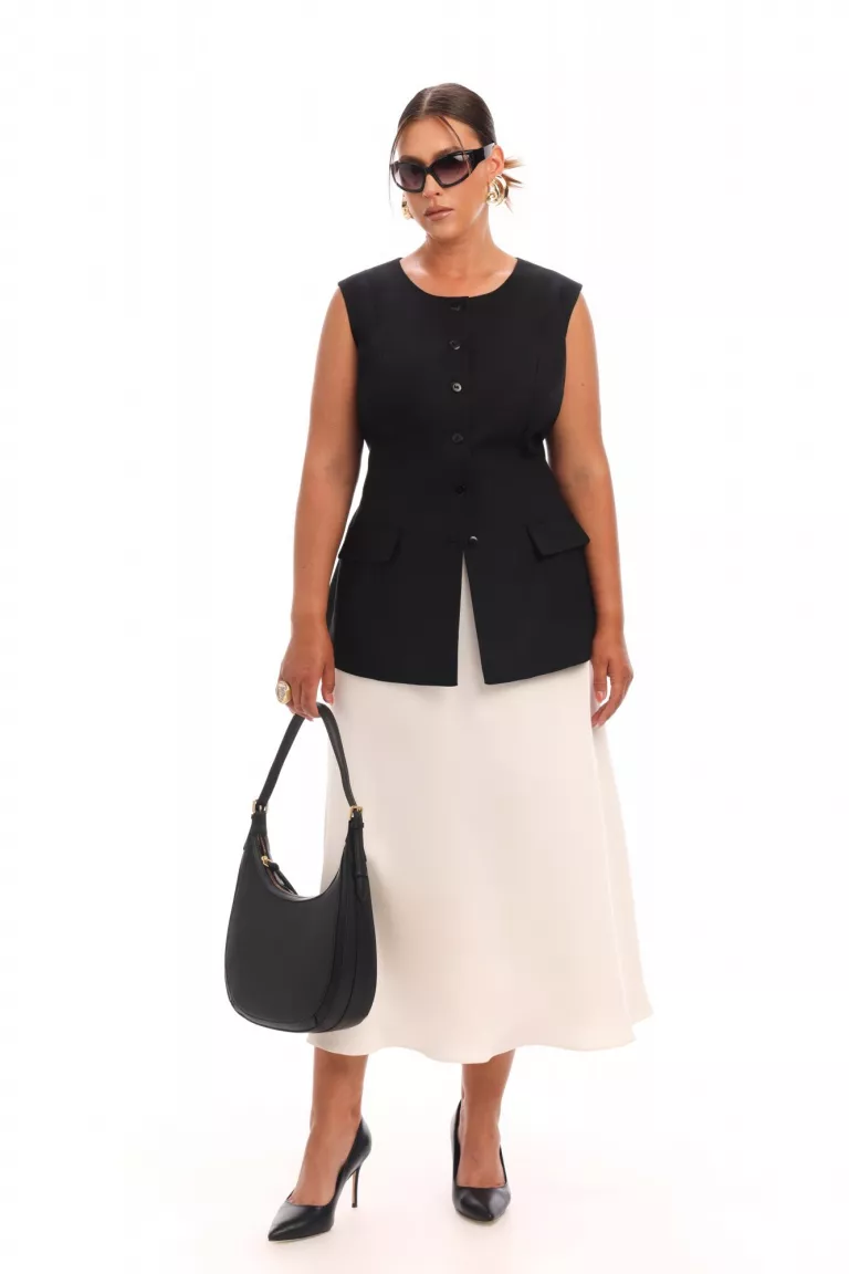 Однобортный жилет приталенного силуэта, на подкладке и пуговицах, из костюмной ткани. Длина миди. Без воротника. На спинке рельефы, центральный шов. Спереди вертикальные вытачки и мнимые карманы. Выраженная линия плеча. В качестве застежки пуговицы.