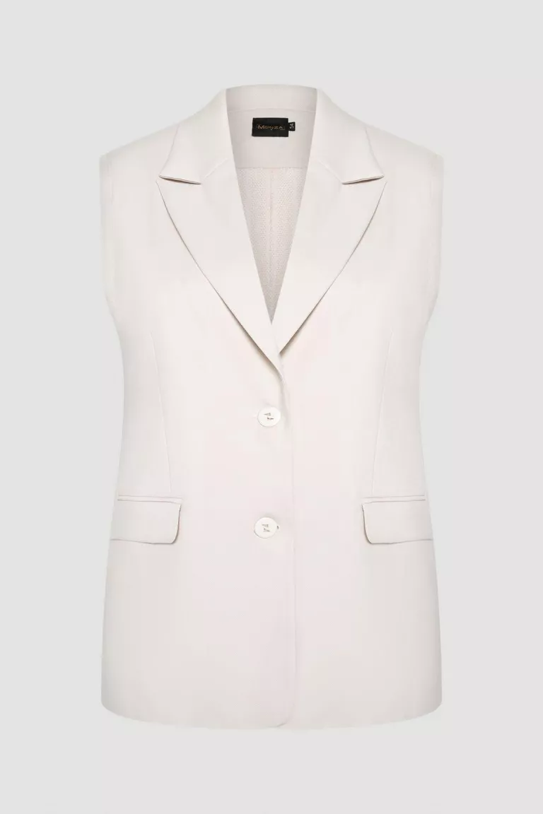 Однобортный жилет полуприлегающего силуэта, на подкладке и пуговицах, из костюмной ткани. Длина миди. Воротник английский, с лацканами. На спинке рельефы, центральный шов. Спереди вертикальные вытачки и внутренние карманы. Выраженная линия плеча, с необработанным краем. В качестве застежки пуговицы.